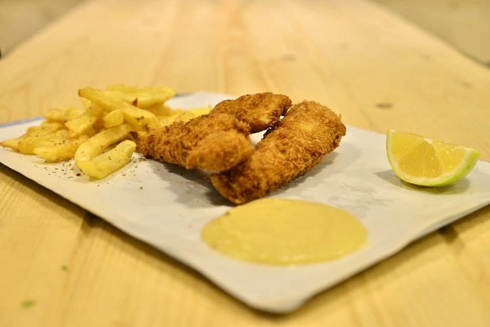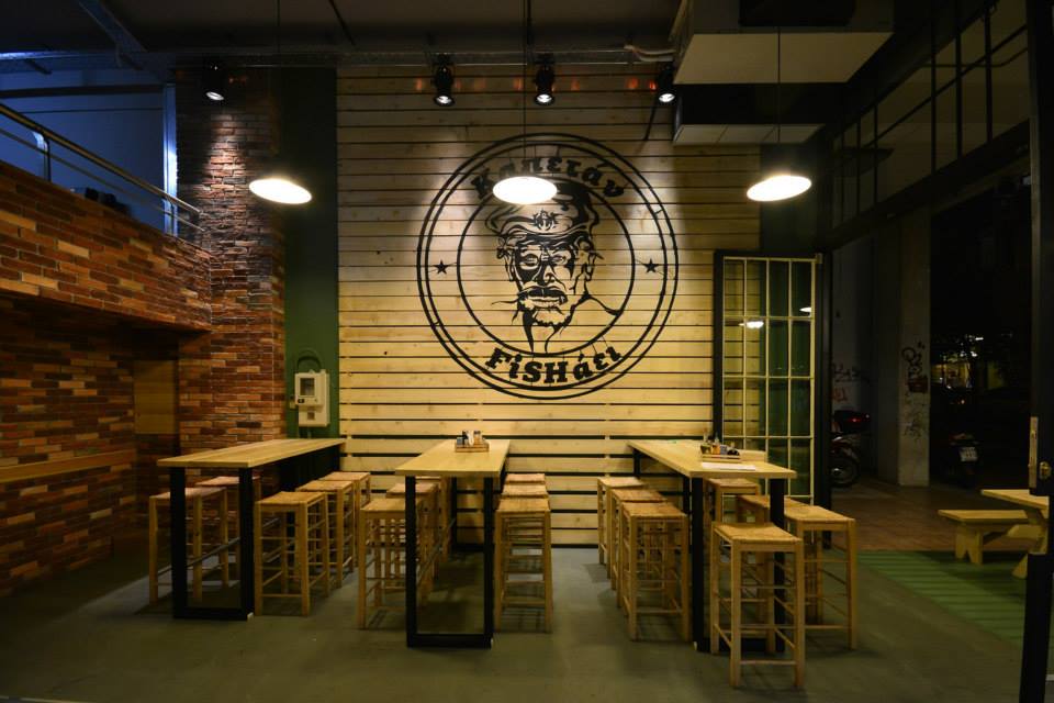 Ένας βιομηχανικός χώρος  με έμφαση στο τούβλο, ανθρακί τοίχους ανοιχτόχρωμους ξύλινους πάγκους και stands. Τι κρύβει όμως ο Καπετάν Fishάει; Απλά το καλύτερο street food για θαλασσινά!