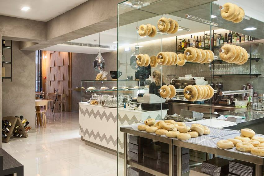 Πρόκειται για το γνωστό, δημοφιλές και αγαπητό αμερικάνικο σνακ που θυμίζει σάντουιτς με το ψωμάκι σε σχήμα δαχτυλιδιού που όμως περνάει από ειδικό τρόπο παρασκευής, αφού πρώτα βράζεται το ζυμάρι σε καυτό νερό και έπειτα ψήνεται στο φούρνο. Οι επιλογές που υπάρχουν είναι πολλές, καθώς όχι μόνο μπορεί κανείς να διαλέξει το περιεχόμενο του bagel του, αλλά και το ίδιο το ψωμί, που ποικίλει από λευκό, ολικής άλεσης, με σουσάμι, ελιά μέχρι και με παπαρουνόσπορο . Δυο γευστικότατες προτάσεις είναι το bagel με λεπτές φέτες ψητού φιλέτου με σάλτσα horseradish, και αυτό με το σολωμό που πριν σερβιριστεί στο πιάτο σας έχει μαριναριστεί για 48 ώρες σε διάφορα εσπεριδοειδή με αποτέλεσμα να αναδεύει το πιο δροσερά αρώματα. Για συνοδευτικό επιλέξτε τη σαλάτα με τις γαρίδες, αν και οφείλουμε να πούμε πως οι μερίδες είναι ιδιαίτερα πλούσιες και χορταστικές ! Για επιδόρπιο δεν ξέρεις τι να πρωτοδιαλέξεις… Τη νοστιμότατη τάρτα με φιστίκι ή σοκολάτα, μια creme brûlée, την τάρτα χωρίς γλουτένη με λευκή σοκολάτα και αχλάδι ή μήπως κάποιο γλυκό bagel; Το μενού εχει ήδη εμπλουτιστεί με σούπες ημέρας όπου οι πελά τες έχουν την ευκαιρία να γευθούν τη σούπα σελινόριζας με σπανάκι,τη βελουτέ κολοκύθας, κάστανου και πολλές ακόμη. Για κάποιον που θα ήθελε να συνοδεύσει το γεύμα του με κάτι δροσιστικό υπάρχουν φυσικοί χυμοί και γι αυτούς που θα ήθελαν να κλείσουν τη γευστική τους εμπειρία με κάποιο ρόφημα τι καλύτερο από ένα ζεστό τσάι και χειροποίητα μπισκότα ginger, αμύγδαλο ή φιστίκι Αιγίνης. Όλα τα προϊόντα του Madeya είναι από αγνά υλικά και παρασκευάζονται μπροστά σας, στην εμπνευσμένη κουζίνα που περικλείεται με τζάμι και επιτρέπει τη θέαση στους επισκέπτες του. Τέλος το καλύτερο απ’όλα είναι οτι κάθε Κυριακή θα σερβίρεται brunch όπου μεταξύ άλλως θα μπορείς να φας και pancakes με αυγά!